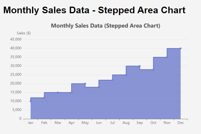 1. Discrete Intervals: Stepped area charts are best for data that changes at specific points rather than continuously. This makes them suitable for situations like monthly sales figures or quarterly profit margins.