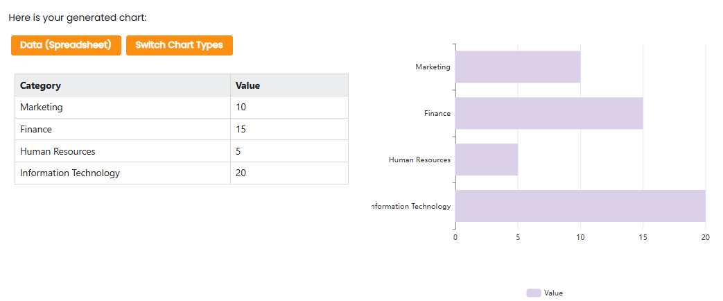 • The x-axis lists the categories: Marketing, Finance, Human Resources, and Information Technology.