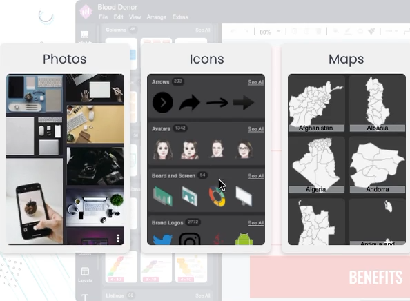 Elevate your information into captivating visuals using our dynamic design blocks. Explore a diverse collection of layouts to effectively visualize your data, ensuring a memorable impression that resonates with your audience.