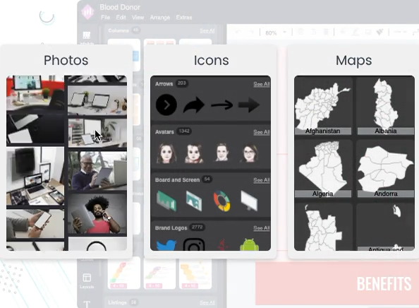 - Add high-resolution stock photos and icons from our library.